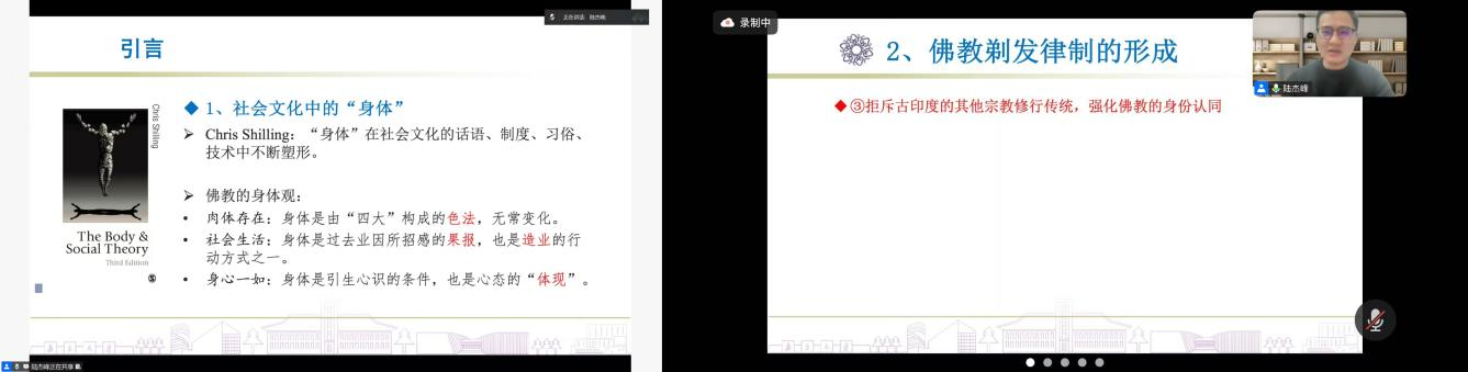 会议中,陆杰峰研究员以“佛教剃发的象征意义及其伦理争辩”为主题,从宗教学、哲学、伦理学等多维视角,系统梳理了佛教剃发习俗的历史渊源、仪式内涵与文化象征。他结合早期佛教经典与禅宗文献,深入剖析了“剃发”作为宗教实践的内在逻辑及其在身份建构、修行伦理与社群认同中的重要作用,通过跨文化比较与案例分析,探讨了这一古老仪式在现代语境下的象征延续与意义重构,引导师生进一步思考宗教传统与社会伦理、个体自由与文化认同之间的复杂关系,为学院师生提供了一场思想性与对话性并重的学术体验。学院孙功进教授、冯相磊老师、相福星老师、河南大学孙少飞老师以及部分学生围绕讲座主题与陆杰峰老师展开讨论。