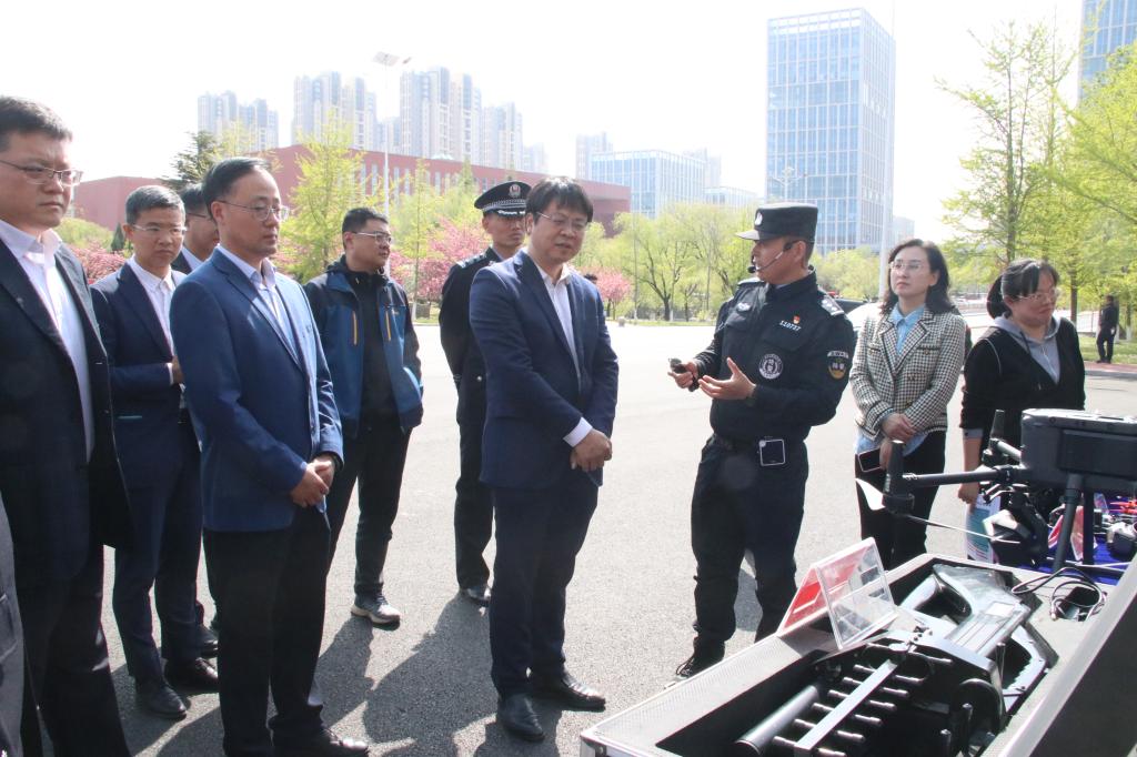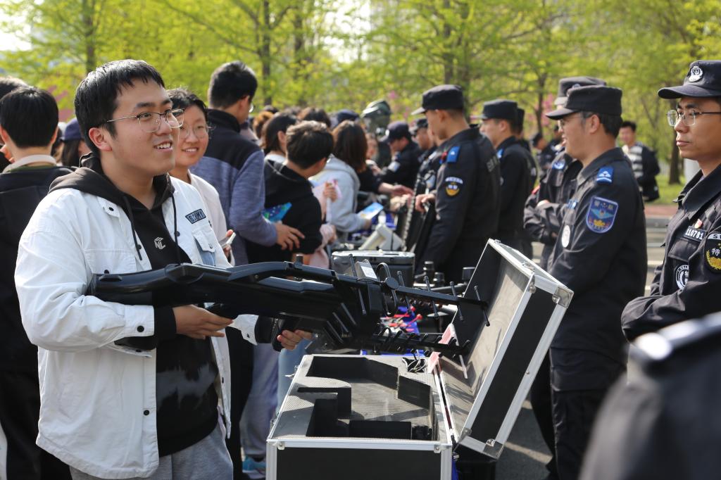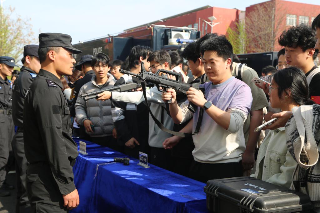 在警用装备展示区,各类武器警械装备整齐陈列,日照市公安局特警支队专业人员现场讲解,结合国防安全背景,细致讲解每一件装备的性能参数、用途功效,全方位展现我国国防科技实力与国防建设的丰硕成果,让师生们直观感受国家安全的坚实保障。
